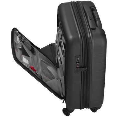 deslocamentos profissionais. Com design moderno e estrutura em PC/ABS, oferece alta resistência e leveza. Seu compartimento frontal moldado funciona como um escritório móvel, com espaço dedicado para notebook de até 14” e tablet de até 10”. Possui trava TSA, porta USB com cabo de carregamento, bandeja de identificação, bolso de acesso rápido e rodas duplas silenciosas com giro de 360°.