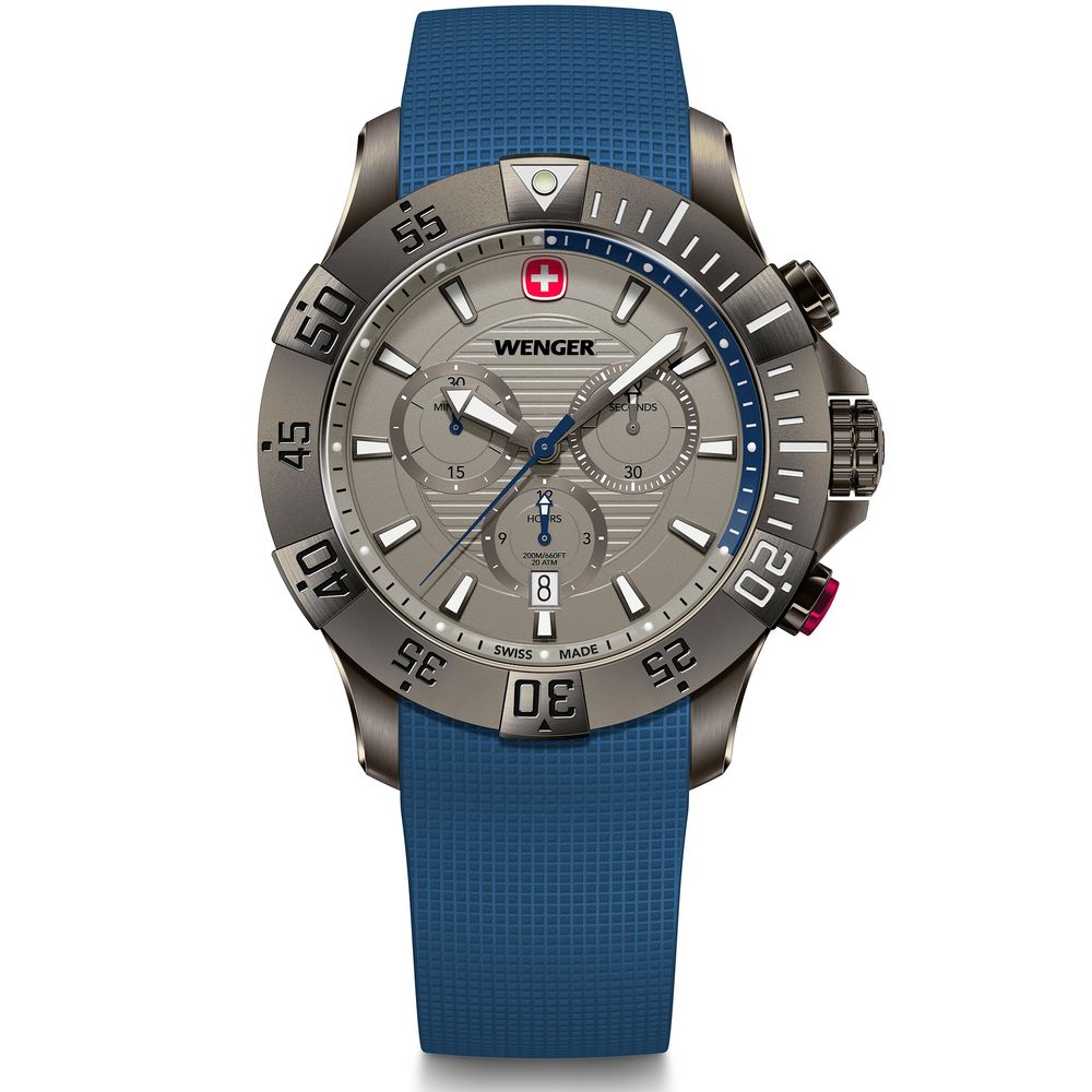 O Wenger Seaforce Chrono 43MM é um relógio suíço robusto e funcional, ideal para quem busca desempenho e estilo esportivo. Com caixa preta, mostrador preto e pulseira de silicone azul, oferece resistência à água de até 200M (20ATM) e função cronógrafo para máxima precisão.