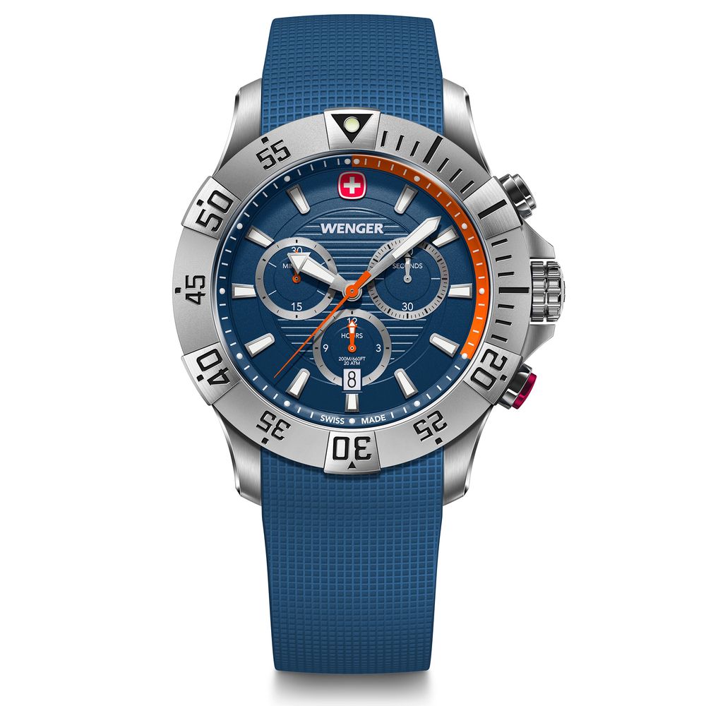 O Wenger Seaforce Chrono 43MM é um relógio suíço robusto e funcional, perfeito para quem busca desempenho e estilo esportivo. Com caixa em aço inoxidável prateada, mostrador azul com detalhes prateados e pulseira de silicone azul, oferece resistência à água de até 200M (20ATM) e função cronógrafo para máxima precisão.