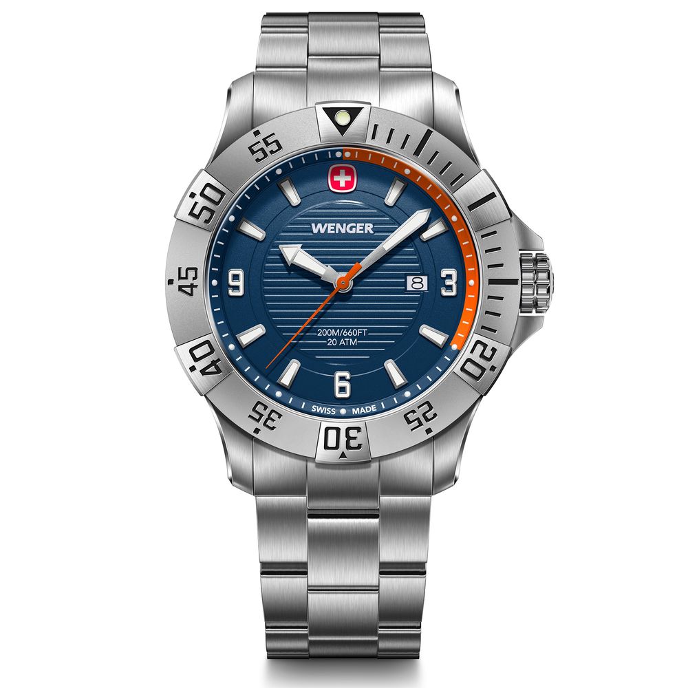 O relógio Seaforce da Wenger foi desenvolvido para entusiastas de aventuras urbanas que buscam resistência e estilo. Com caixa em aço inoxidável de 43 mm e mostrador azul profundo, oferece robustez com resistência à água de até 200 metros (20 ATM), ideal tanto para esportes aquáticos quanto para uso cotidiano.