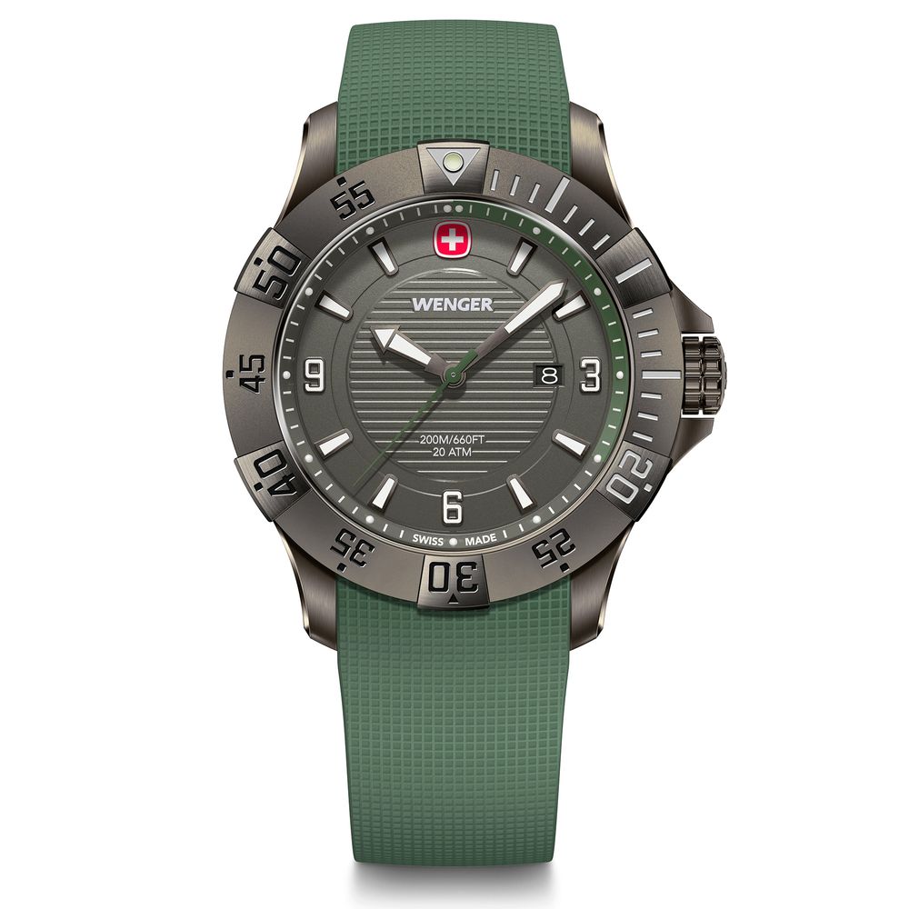O Wenger Seaforce de 43 mm combina robustez e estilo esportivo com uma estética moderna. Com caixa de aço inoxidável acabamento Black Ice e pulseira em silicone verde, é resistente à água até 200 m (20 ATM), ideal para explorar ambientes urbanos e aquáticos.