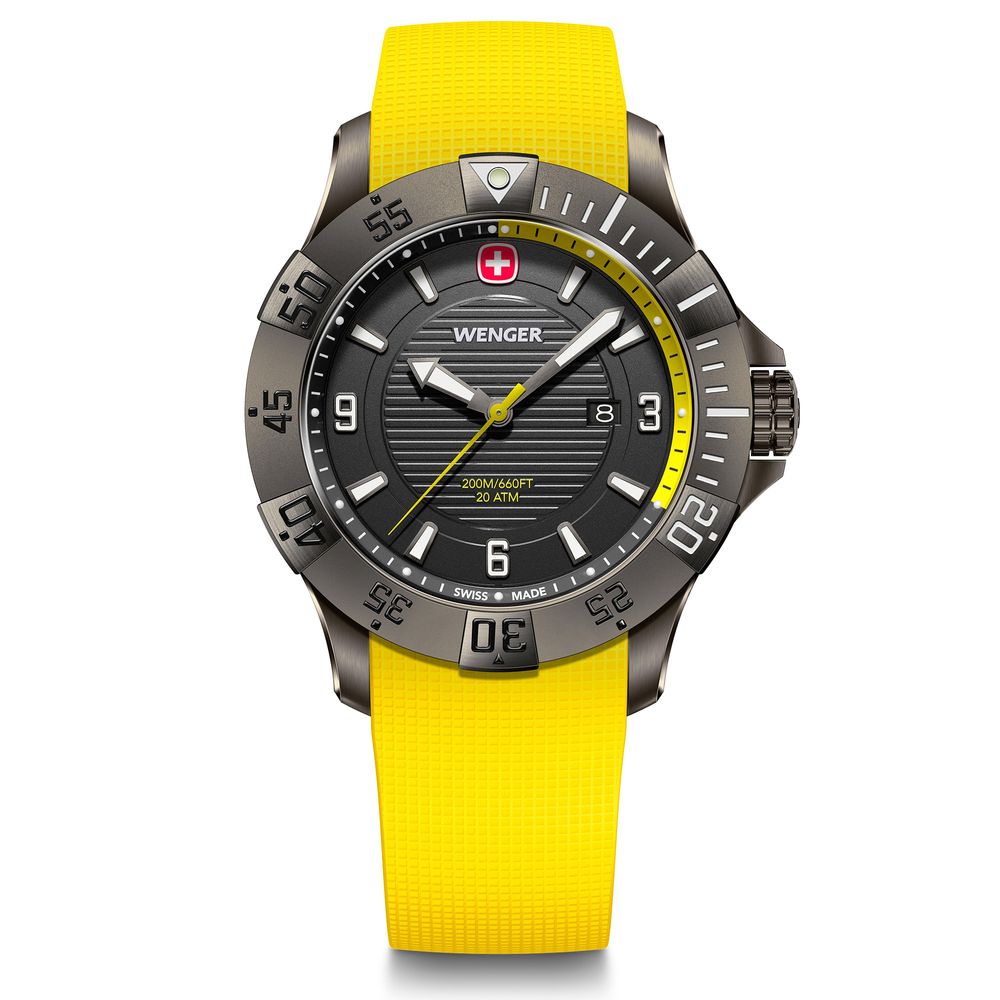 O Wenger Seaforce 43MM combina robustez e estilo esportivo com um toque vibrante. Sua caixa em aço inoxidável com acabamento Black Ice e pulseira de silicone amarela resultam em um design moderno e resistente. Com resistência à água de até 200M (20ATM), é ideal tanto para atividades urbanas quanto aquáticas.