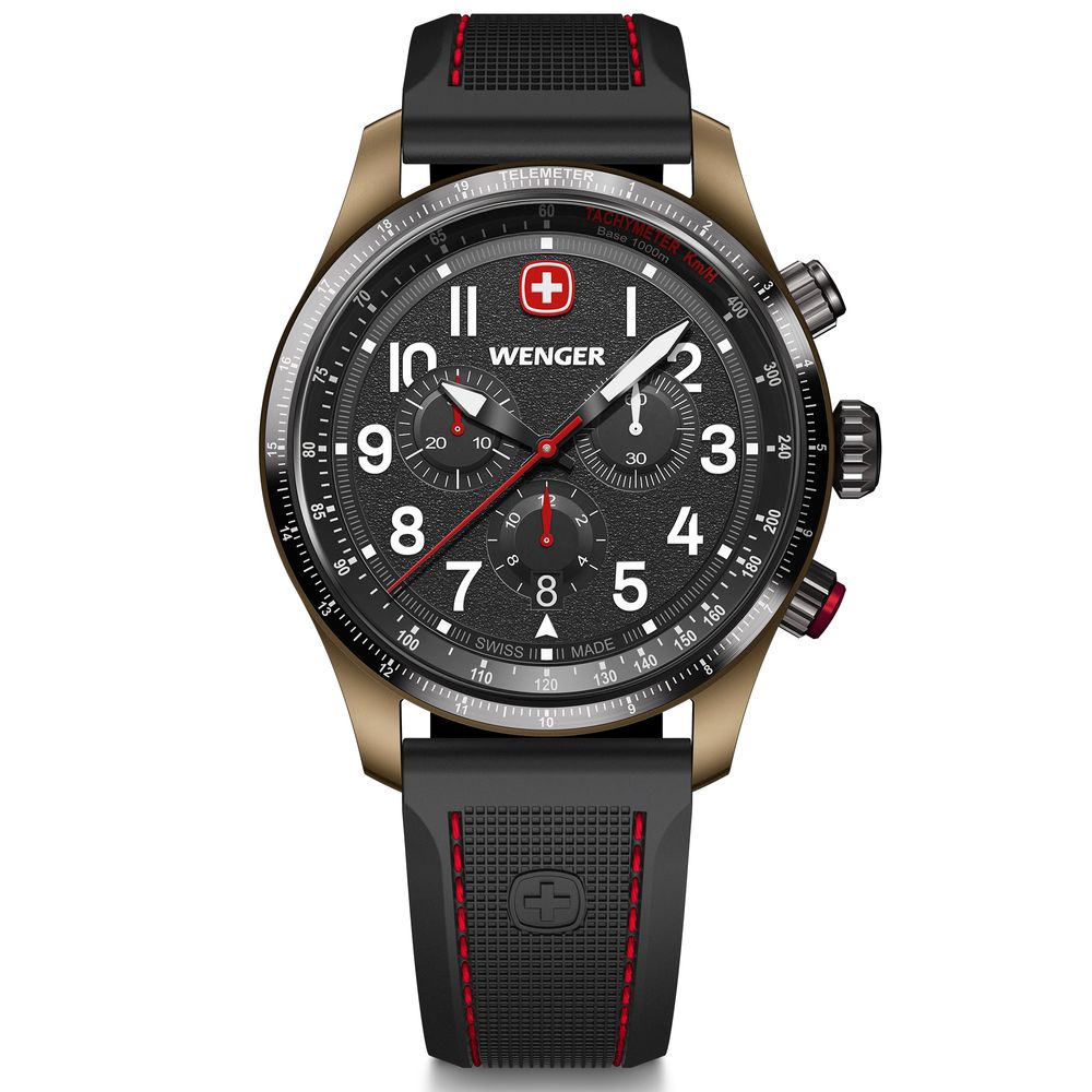 O Terragraph Chrono é um relógio suíço masculino da Wenger com visual esportivo e acabamento sofisticado. Equipado com movimento quartzo suíço, ele oferece funções de cronógrafo, taquímetro, data, hora, minuto e segundo, com excelente legibilidade graças aos ponteiros e marcadores com iluminação Super-LumiNova®.